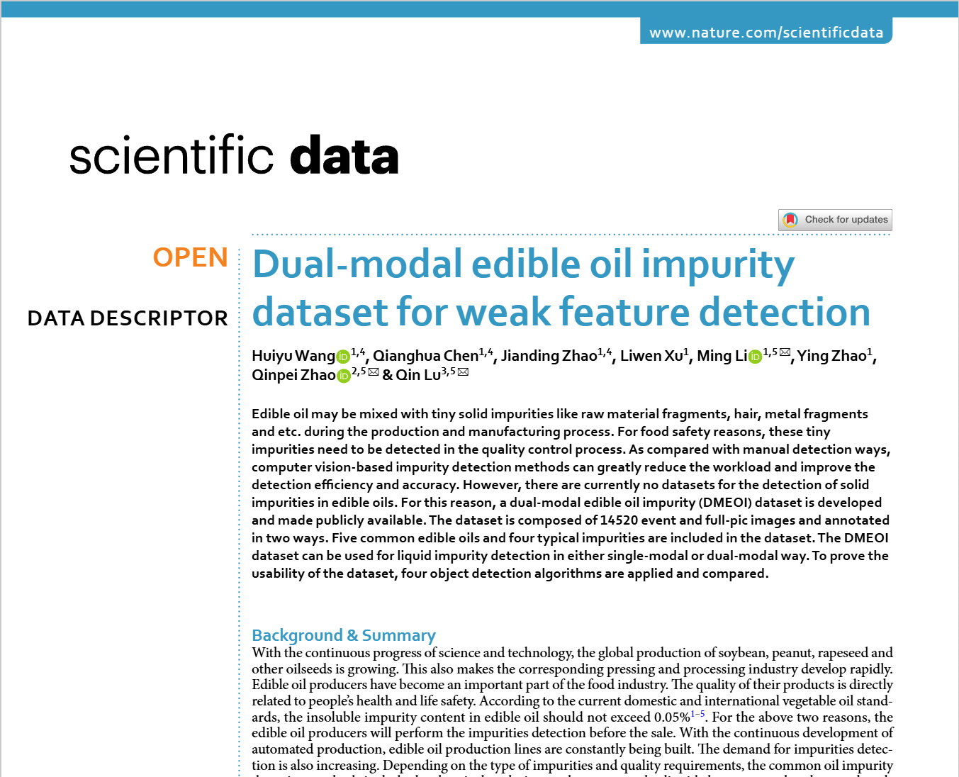 Recently, a research paper titled “Dual-Modal Edible Oil Impurity Dataset for Weak Feature Detection” jointly supervised by Li Ming and Zhao Ying from the Intelligent Vision Team of School of Electronics and Information Engineering (SEIE) was published inScientific Data, a journal underNature. The journal specializes in datasets and research promoting the sharing and reuse of scientific data. It is an SCI Q1 journal with a five-year impact factor of 8.9. The research, with SDJU as the first institution, was completed in collaboration with researchers from Tongji University and Shanghai Jiao Tong University School of Medicine. The co-first authors are Wang Huiyu and Chen Qianghua (graduate students majoring in Electrical Engineering), as well as Zhao Jianding (graduate student majoring in Electronic Information).