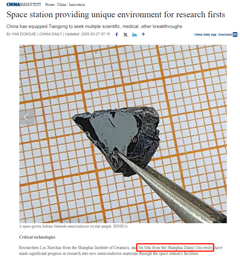 On March 27, 2025, China Daily, China’s only national English-language newspaper with a global readership, published a feature introducing several representative research breakthroughs associated with China Space Station(CSS)since its operation in 2021. Among these research firsts was a major scientific study led bySDJU Professor Jin Min’s team in collaboration with partner institution, which was reported in detail as one of the key research achievements.